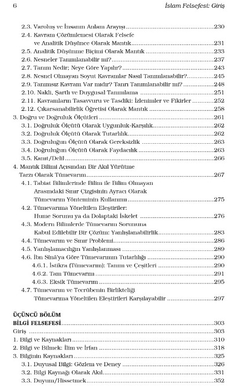 Elinizdeki kitap, İslam Felsefesi Teşekkül Dönemi ve İslam Felsefesi Tenkid Dönemi (Elis Yay.) serisinin üçüncüsü olup, Felsefeyi Anadolu’da Yeniden Yurtlandırmak için İslam Felsefesini tematik olarak -Mantık, Bilgi, Bilim, Varlık, Siyaset bağlamında- okuma çabasıdır. İslam Felsefesi: Giriş adlı çalışmanın ilk bölümünde tıpkı Fârâbî’nin İlimlerin Sayımı adlı eserinde olduğu gibi Dil Felsefesi üzerinden dil, düşünce ve mantık irtibatının sağlanması amaçlanmaktadır. Bilgi Felsefesi kısmında “Hakikat”i araştırmada kullanılan epistemolojik yetilerin neliği üzerinde durulmuştur. Rasyonalist, ampirist, nominalist öğretilerin açmazlarının kavramcı-realizm ile aşılma imkânı Fârâbî merkezli incelenmiş, İbn Tufeyl’in Hay b. Yakzân ve İbn Sînâ’nın Boşlukta Uçan Adam öğretileri müzakere edilmiştir. Bu bilgilerin sistematik hâle getirilmiş şekli, Bilim Tarihi ve Felsefesi bölümünde incelenmiş, İslam ilimler tasnifi üzerinde durulmuştur.