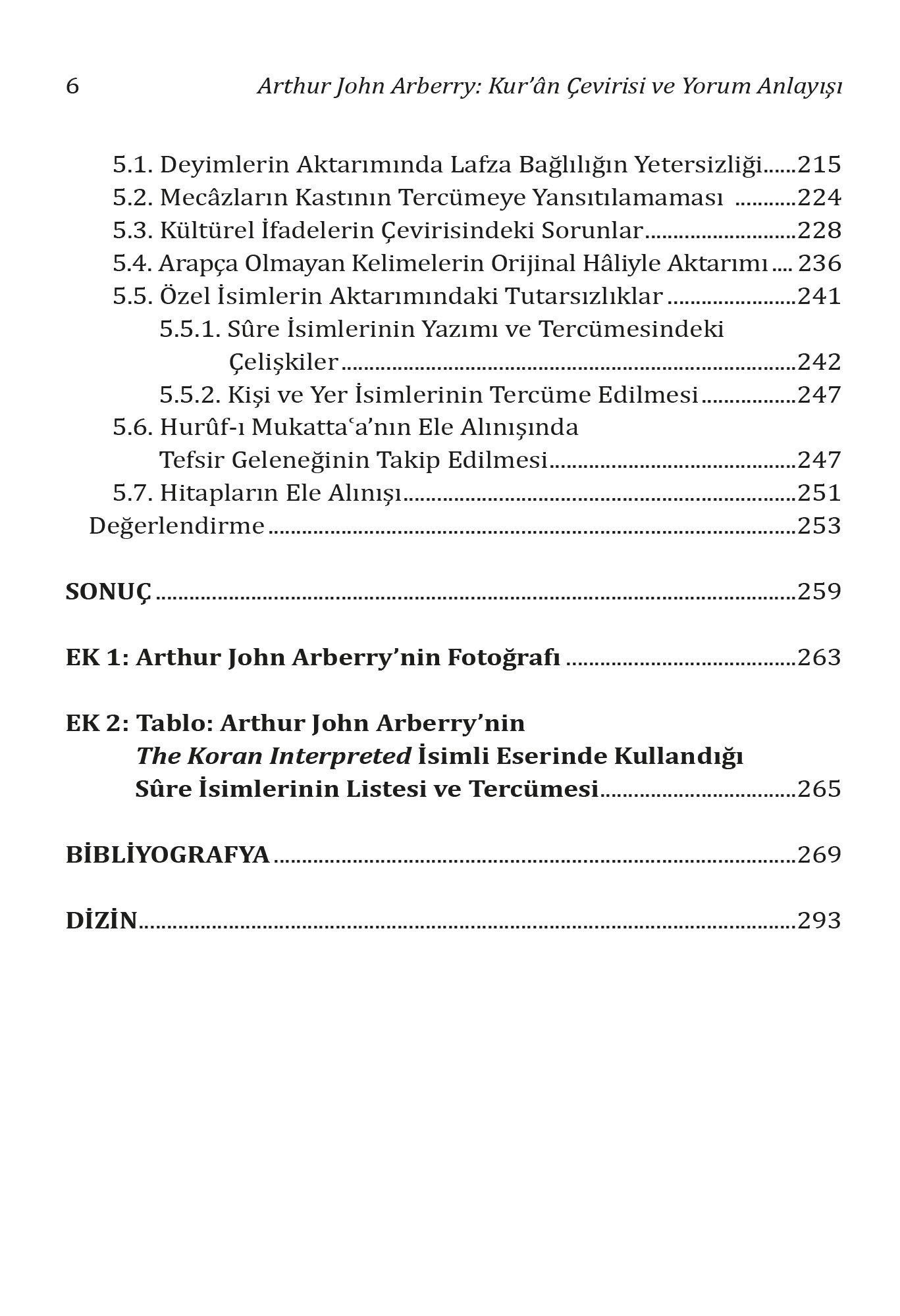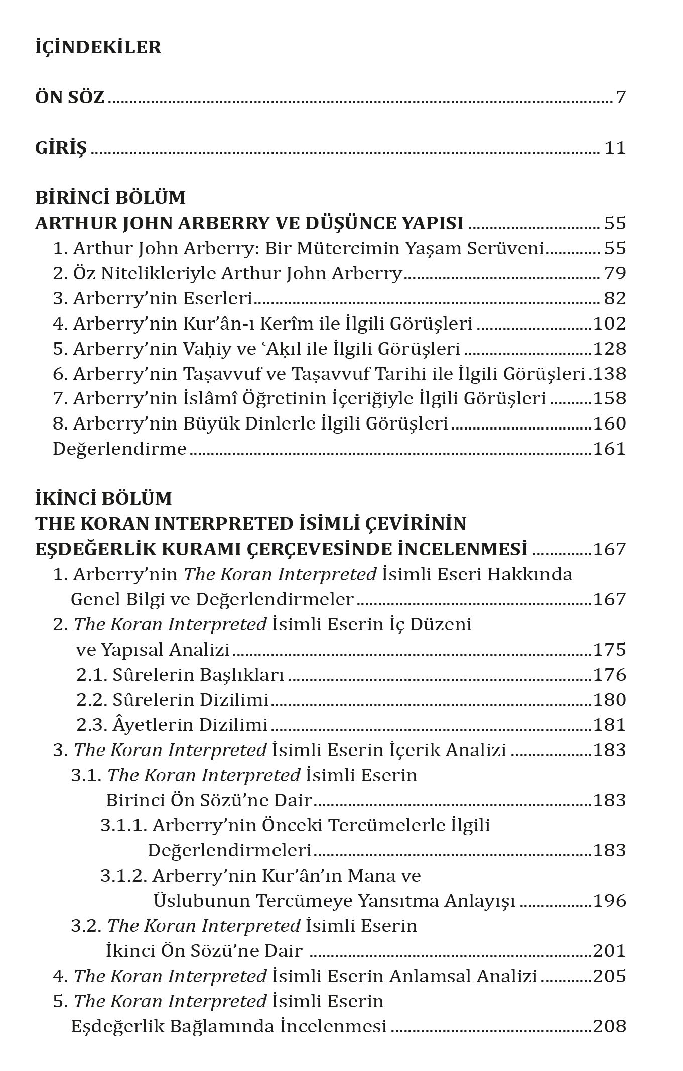 Kur’ân-ı Kerîm’in İngilizce tercüme tarihini, çalışmamızın ana konusunu teşkil eden tercüme eserin müellifi olan, sanat, edebiyat, Ṣûfizm gibi alanlarda nitelik ve nicelik bakımından kaliteli pek çok eser kaleme alan, 1905-1969 seneleri arasında yaşayan İngiliz oryantalist, memur, kütüphaneci, tercüman, filolog,akademisyen Arthur John Arberry’nin içine doğduğu ve içinde yaşadığı şartları anlamak adına yaşam serüvenini, karakteristik özelliklerini, onu yansıtan eserlerini, İslâmî literatürde büyük önemi haiz Kur’ân-ı Kerîm, vaḥiy ve aḳıl, taṣavvuf, İslâmî öğretinin (Islāmic teaching) temel içeriği ve büyük dinler gibi meselelerdeki görüşlerini, The Koran Interpreted isimli Kur’ân-ı Kerîm’in İngilizce tercümesini yapısal, içeriksel, anlamsal ve eşdeğerlik düzlemlerinde iki bölüm çerçevesinde inceledik.